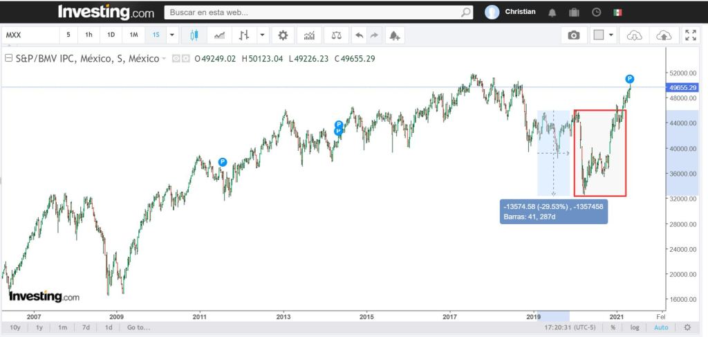 Pues aquí, si hubo «miel sobre hojuelas». Resulta que, la Bolsa Mexicana de Valores ya venía de tener un MAL comportamiento en años anteriores. Recordemos que desde julio de 2017 (Que tuvo máximos históricos), hasta abril de 2020 (acentuado por la pandemia), tuvo un descenso de 36% de su valor. Influenciado (creo yo) por algunos temas políticos dentro de México (Gobierno de EPN), la entrada de TRUMP a la presidencia de USA, y la gran posibilidad de un gobierno de izquierda en México (Ahora una realidad).