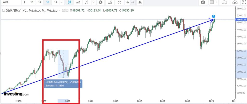 SIN EMBARGO, no todo ha sido «miel sobre hojuelas»; recordemos que el país (México) ha pasado por algunas crisis; algunas más grandes que otras. Por ejemplo, en el año 2008, producto de la crisis de los «Sub prime» en U.S.A., el índice bajó alrededor de 50%. Imagínate que, si hubieras invertido 1,000 USD en mayo de 2008, en febrero de 2009 tendrías la mitad de tu dinero (500 USD).