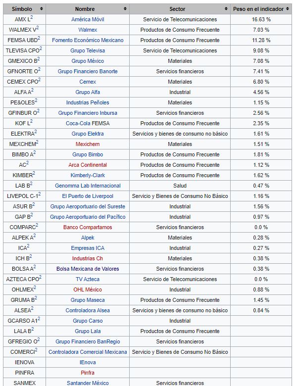 El valor de este índice sube o baja, en función de cómo se comportan los valores de las compañías antes mencionadas. Sin embargo, hay tomar en consideración que no es un promedio lineal, ya que cada compañía tiene un peso diferente. Por ejemplo, las más grandes (América Móvil, FEMSA, WALMART), cuando suben o bajan, pueden arrastrar hacia arriba o hacia abajo a todo el índice.