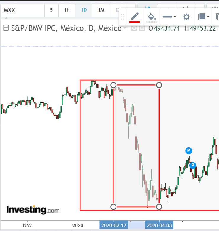 SIN EMBARGO, y aquí quiero recalcar que la baja que tuvo la Bolsa Mexicana o el IPC, empezó el 12 de febrero 2020 y prácticamente terminó el 3 de abril de 2020; es decir que duró prácticamente 2 MESES. Ver ilustración abajo;
