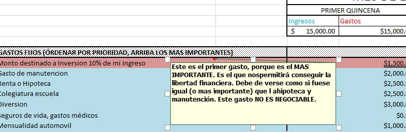 El primer paso es PONER ÓRDEN sobre el dinero que llega a nuestras manos, producto de nuestro sueldo (en este caso). Para lo anterior se deben de colocar todos los gastos que se tienen a lo largo de la quincena (o mes); colocando en la parte superior los MAS IMPORTANTES e imprescindibles.