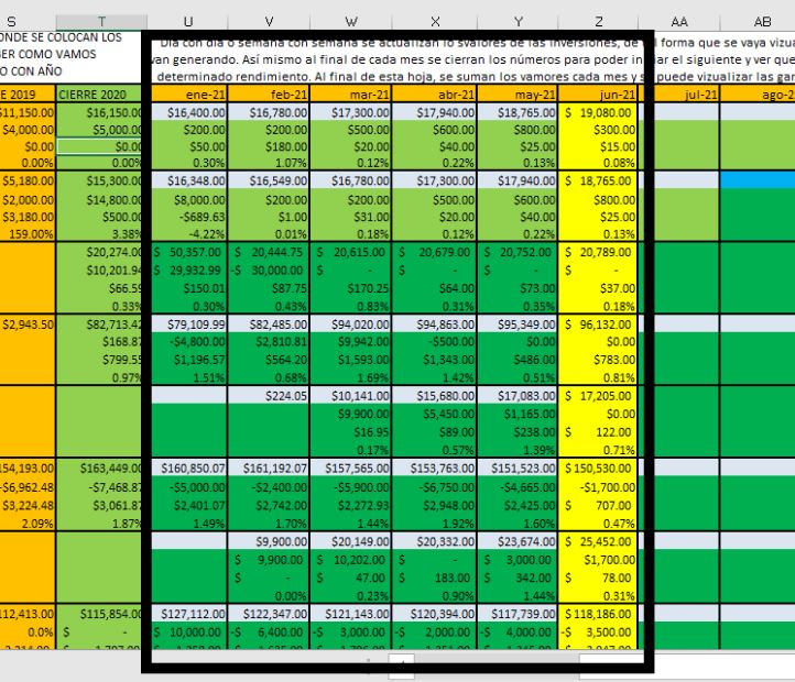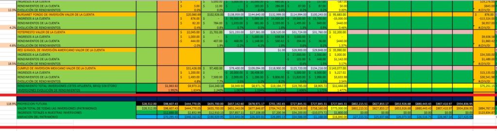 La administración de inversiones, no se trata de únicamente ver tus estados de cuenta mes con mes, o entrar al portal web de a inversión mes con mes y saber que están creciendo. Hay algunos aspectos que se deben de llevar a detalle, para poder medir y actuar en consecuencia. Recuerda que lo que no se mide, no se controla. Para lo anterior yo recomiendo que se haga una tabulación en la hoja de Excel, con las diferentes inversiones que se tienen. Se debe de llevar un récord del dinero que se tiene al día, el dinero que se ingresa a cada inversión, eventualmente el dinero que se saca (para balancear el portafolio, es decir mover de una inversión a otra) y los rendimientos que están generando cada uno de esos activos o inversiones. A esta sección le llamo «SECCIÓN DE ADMINISTRACIÓN DE INVERSIONES»