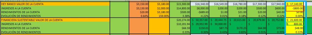 Sacamos $800 pesos de «HEY BANCO» (recuadrito rojo) e ingresamos esos mismo $800 a «FINANCIERA SUSTENTABLE» (recuadrito verde). Así se realizan los movimientos internos de una inversión a otra cuando queramos re balancear nuestro portafolio.