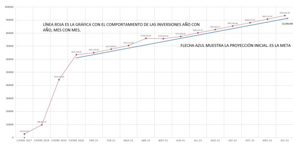 Mas abajo de esa sección viene una gráfica donde aparece el comportamiento del portafolio a lo largo de 3-4 años, más aparte se aprecia como se va comportando mes con mes en el año presente (en este caso el 2021). Obviamente la gráfica va hacia arriba porque el valor de las inversiones va creciendo y aparte mes con mes se agregan fondos producto de la ADMINISTRACIÓN DEL GASTO CORRIENTE. Créanme una cosa; es MOTIVANTE el ver esta gráfica, te hace sentir que estas logrando algo y que vas hacia algún lado y sobre todo TIENES un objetivo al cual apuntar y el cual alimenta la disciplina de que cada semana, quincena o mes, continúes apartar una pequeña parte de tu patrimonio para lograr la LIBERTAD FINANCIERA. Adicionalmente por mi parte, al inicio del año trazo una línea recta con la META (mostrada en color azul), de tal manera que me indica si voy por arriba o por debajo de mi objetivo.