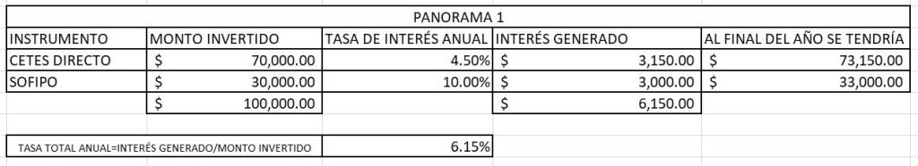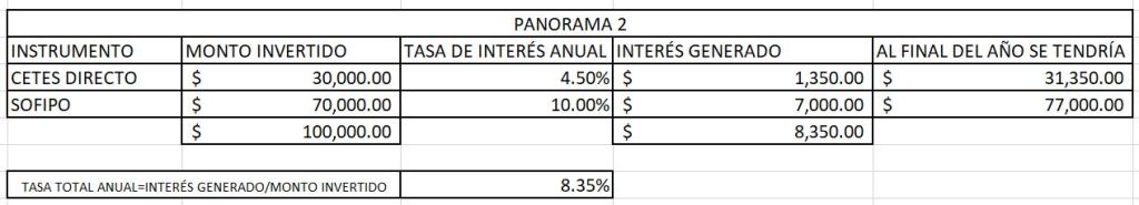 Siguiendo la misma lógica del ejemplo anterior (Panorama #1), sucede que al incrementar el riesgo y colocando menos dinero en CETES (el 30% del capital) y más dinero en la SOFIPO (70% del capital), la tasa de rendimiento total por nuestra inversión sube de 6.15% a 8.35%. Como podemos ver los instrumentos son los mismos, lo que cambia es «LA PONDERACIÓN», que básicamente es la relevancia que tiene dentro de nuestro portafolio. Es decir la ponderación en SOFIPO, ahora es mayor, sobre CETES.