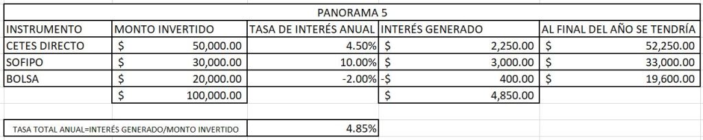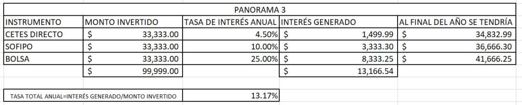 Como se podrá apreciar, en este panorama tenemos que, tener nuestra inversión en 3 partes iguales a una tasa de 4.5%, 10% y 25% respectivamente, generan un rendimiento promedio de $13.17%. ¿No se ve tan mal cierto? Ahorita platicaremos de este tema en el panorama #4.