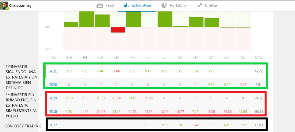 En esos meses, tambien tenía algunas posiciones en copiar portafolios. Hay algunos POPULAR INVESTOR muy buenos y con buenos rendimientos. Sin embargo, me tocó una bajada en la bolsa, y preferí liquidar posiciones en copias y continuar con mi «metodología». Bueno esa fue la crónico del fracaso anunciado; invertir sin estrategia, sin metodología y sin un fin.