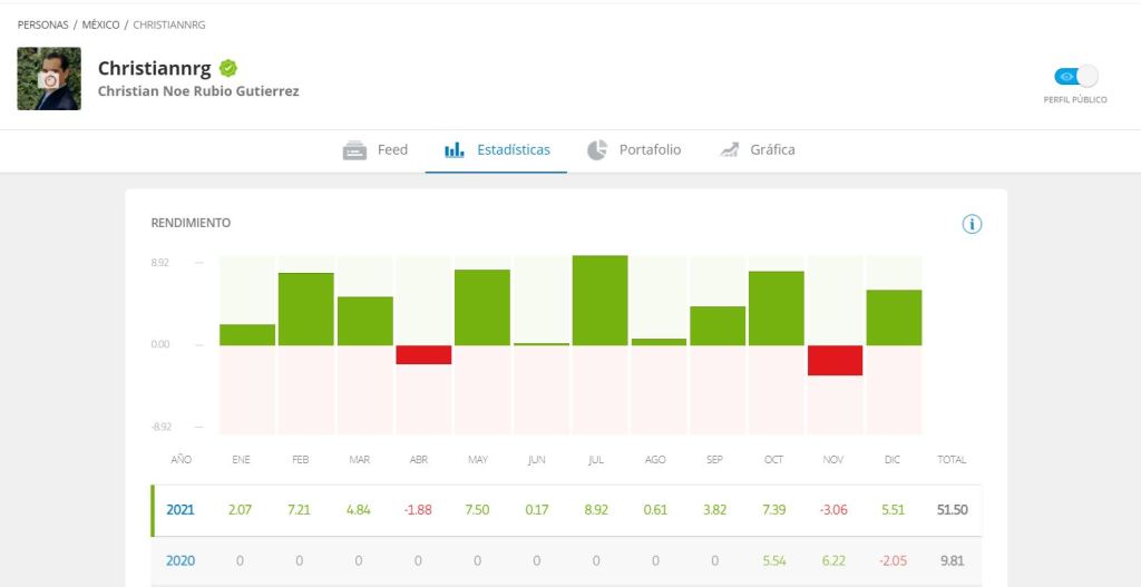 Hace algunas semanas no escribía nada en esta entrada. El mes pasado tuve una pérdida de 3.5% (Y saber que estuve arriba un 5%, el tema fue el cambio en mi operativa, no mas FOREX) sin embargo tal parece que este mes me recupero. Esperamos terminar el año 2021 con 51.5% de rendimiento, lo cual creo que es bastante bueno. Adicionalmente desde agosto que subí mi riesgo a 7, me he mantenido bajo. Si todo sigue como espero, en marzo, podré aplicar nuevamente para el programa «POPULAR INVESTOR». Estoy escribiendo un MEGAPOST En ETORO para agradecer a los que me siguen y me copian.